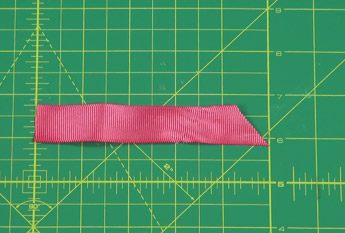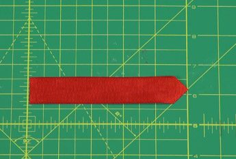 To make a diagonal cut, set the ribbon down flat on a cutting mat and make a diagonal cut using a rotary cutter. You may adjust the angle of the cut accordingly to obtain the desired result.